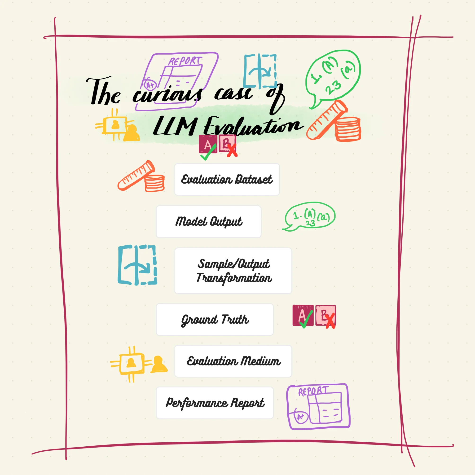 Now that we have that information, let’s talk about the components of LLM evaluation. You can breakdown any LLM evaluation into 6 components: