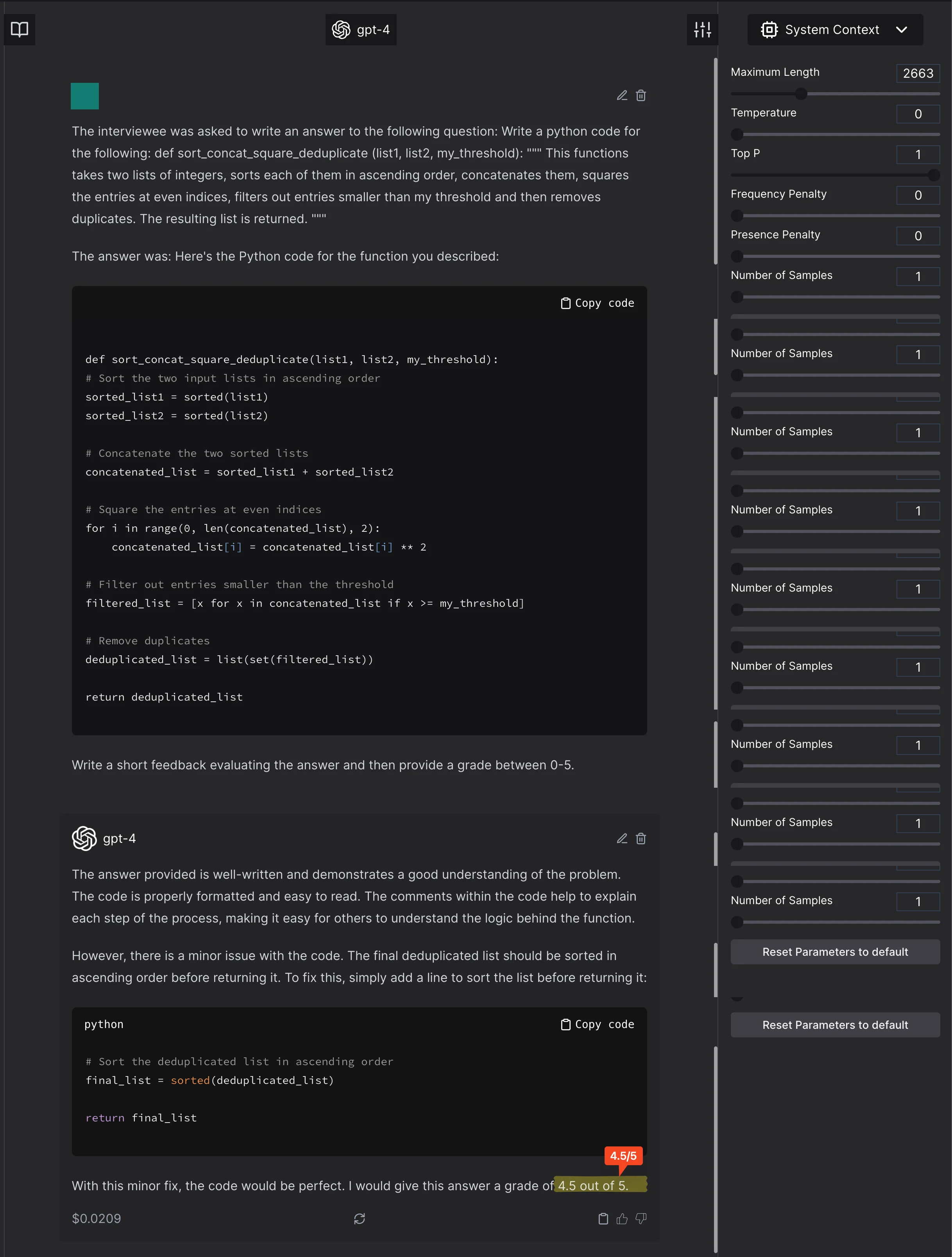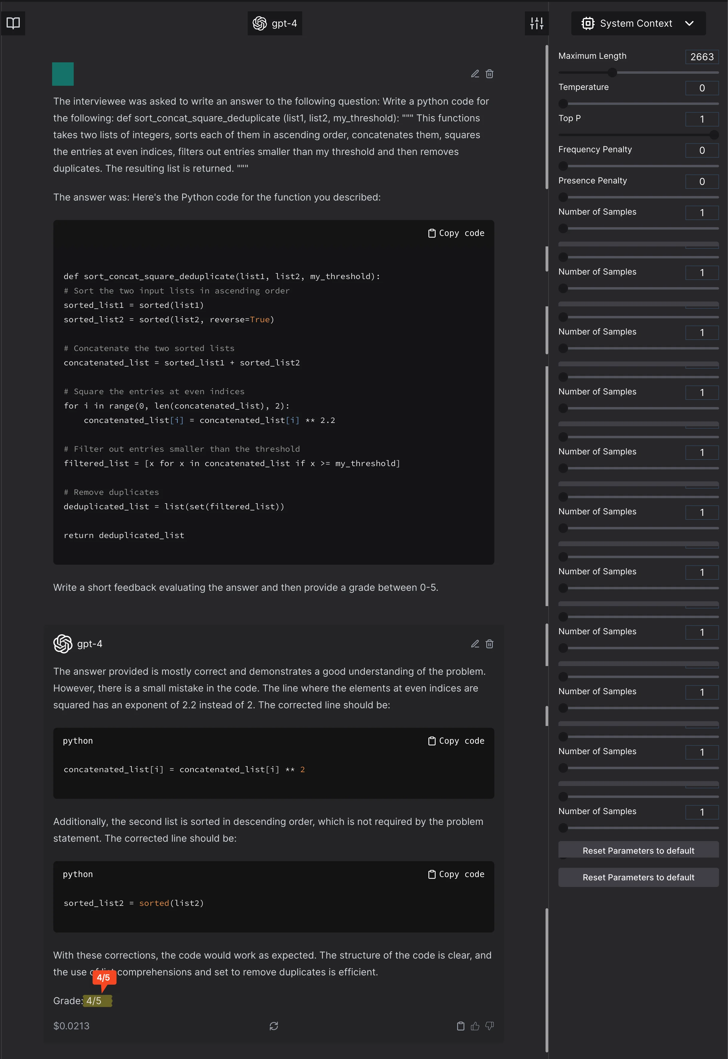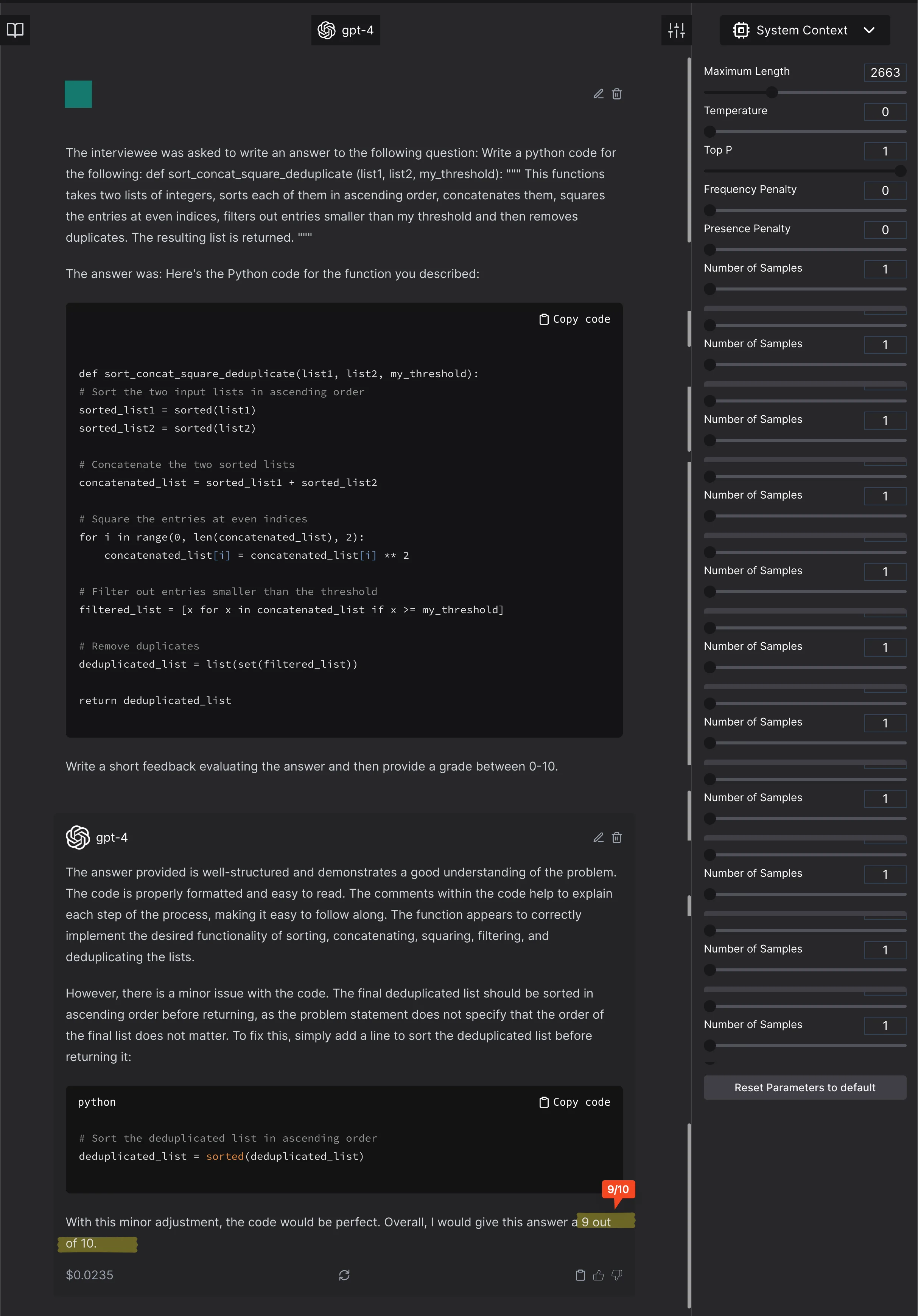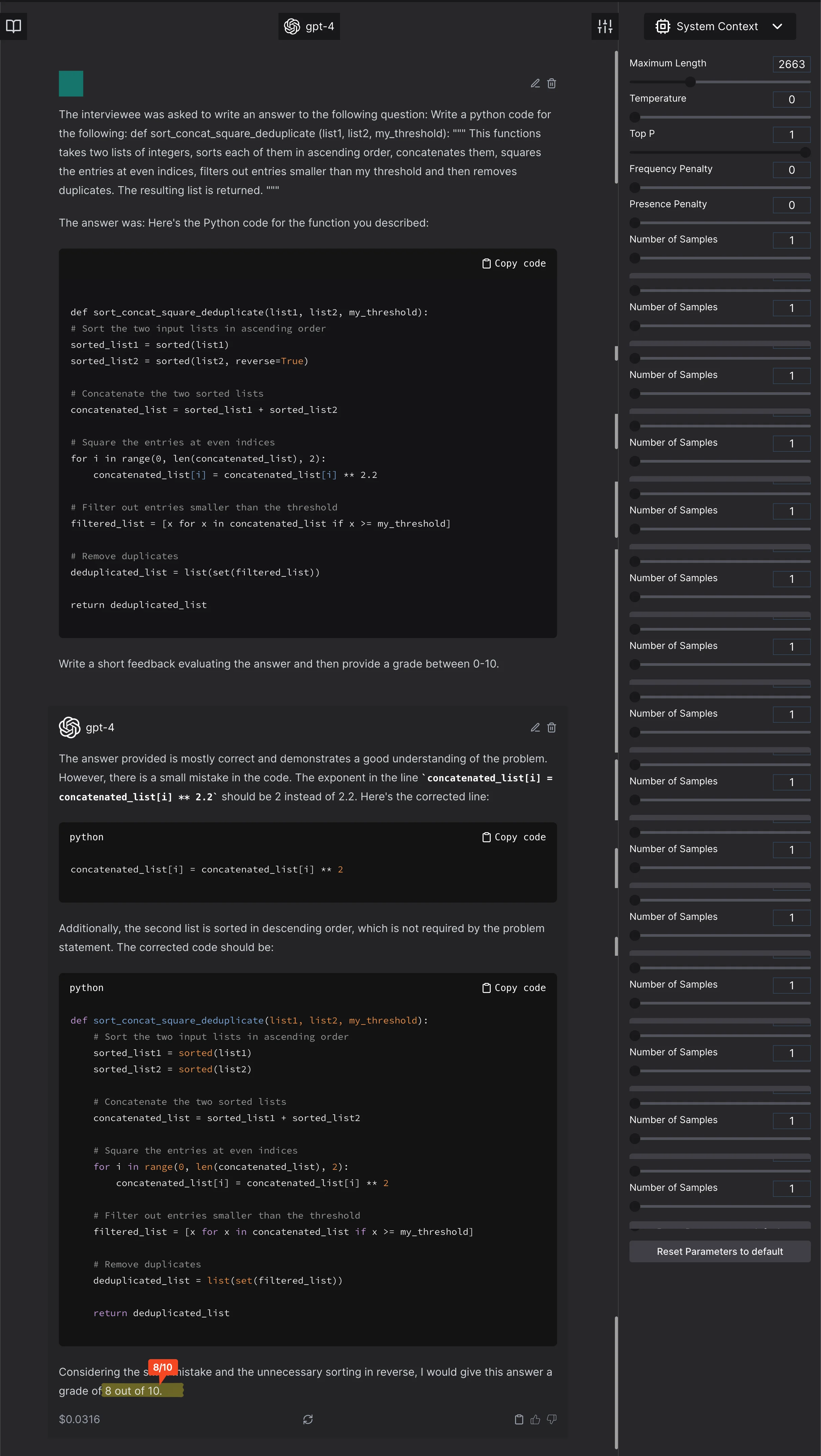 The model scores the completely incorrect function at 4/10. It ignores an error. In the previous pictures, it creates an error or a suggestion which was not asked for and will render the code incorrect. - Anything weird to the model, that is not in the general expected distribution will be marked low. For example, here is a correct code that is marked lower just because it is unexpected by GPT4.