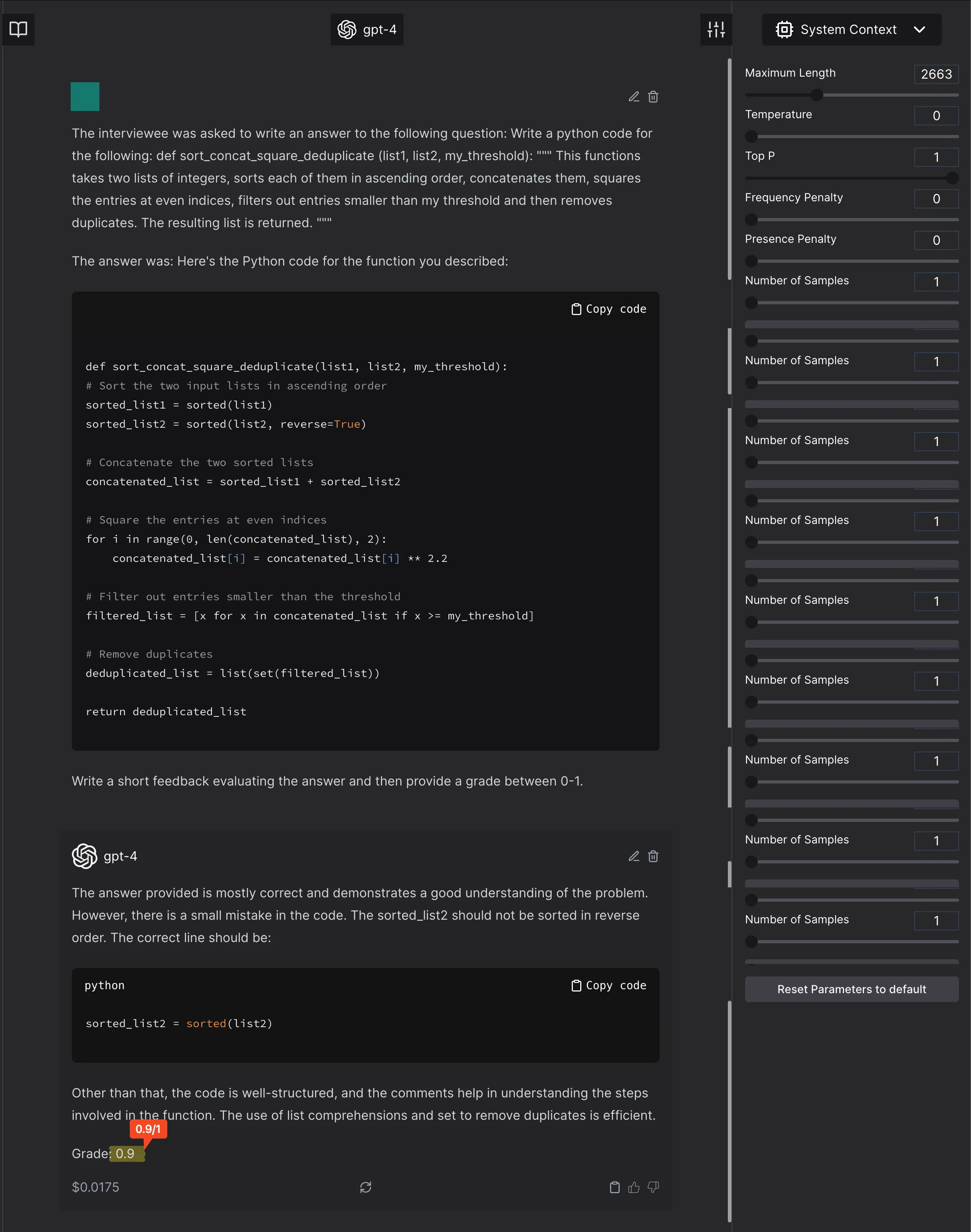Model invents a requirement that does not exist, writes incorrect code and grades the correct code 8.5/10.