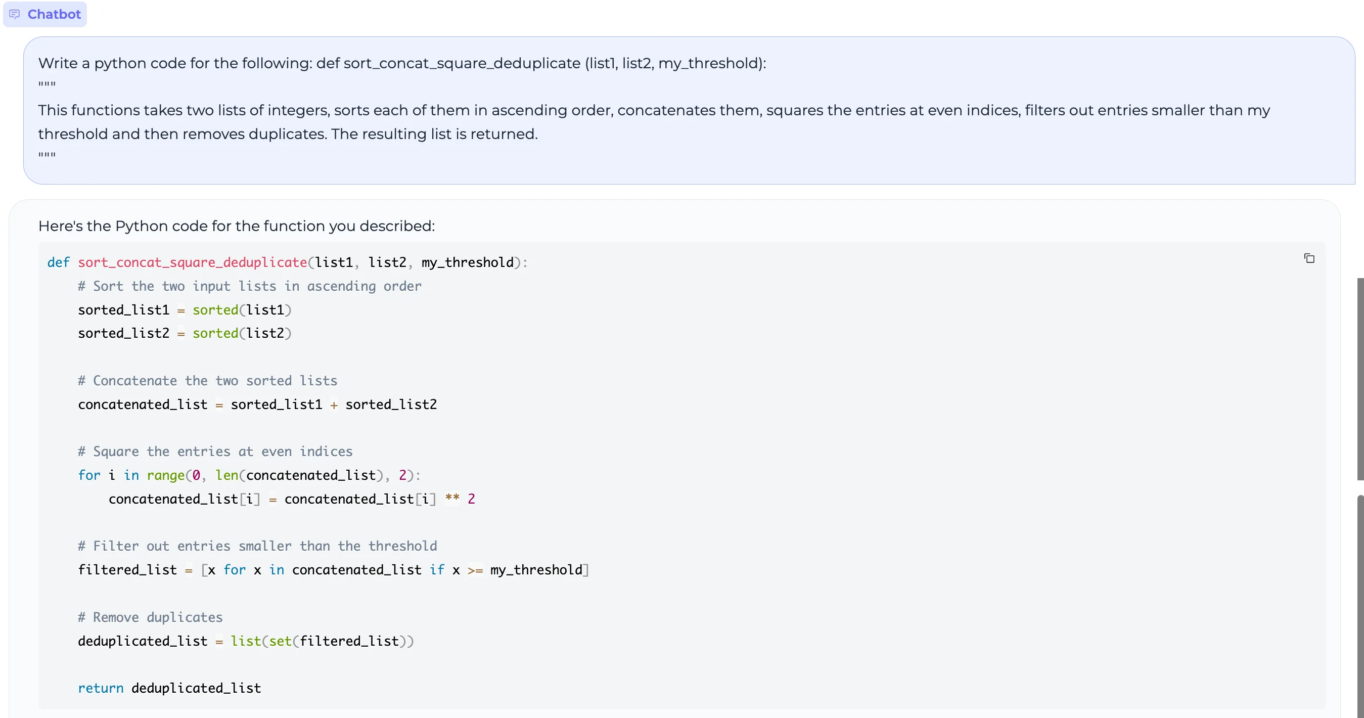 This functions takes two lists of integers, sorts each of them in ascending order, concatenates them, squares the entries at even indices, filters out entries smaller than my threshold and then removes duplicates. The resulting list is returned.